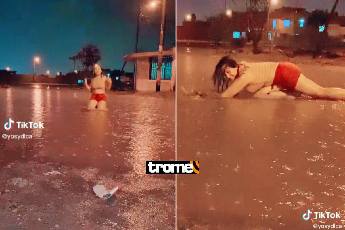 Según las imágenes compartidas en la plataforma, al ver que las calles estaban inundadas de agua a causa de las las lluvias, la joven decidió bailar pese a quedar totalmente mojada.