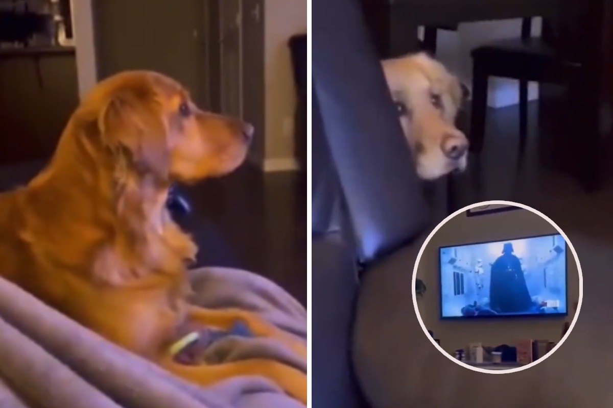 Un perrito junto a su padre humano disfrutaban en la sala de una las clásicas sagas de ficción en el cine: Star Wars, cuando de repente, dejó notarse el temor del cuadrúpedo por uno de los personajes enemigos de la trama.
