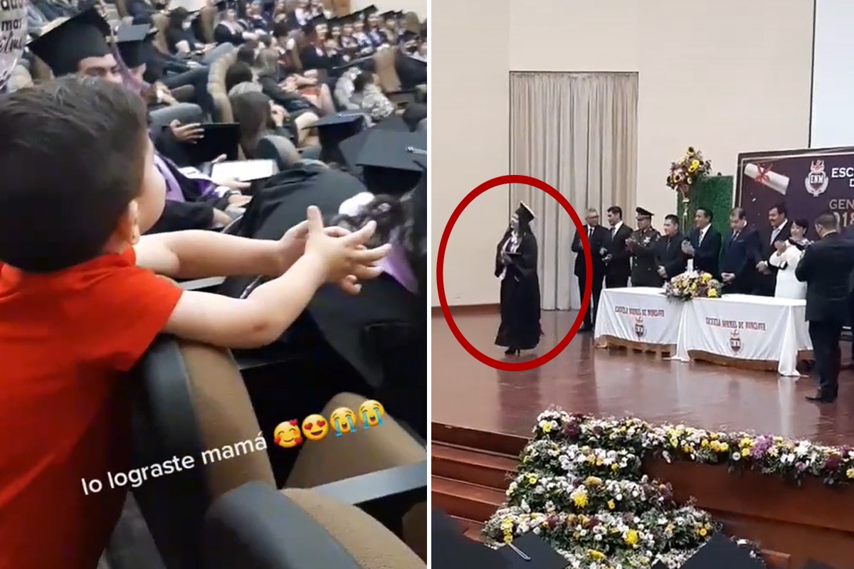 En el clip compartido en TikTok por la hermana de la mujer recién graduada, Eli Aguilar, se ve a la muchacha subir al escenario durante su ceremonia de graduación para recibir su diploma. Mientras la graduada nerviosa recibía el apretón de manos del rector de su universidad, la voz de su hijo gritando muy emocionado remeció todo el auditorio: “Lo lograste, mamá”.
