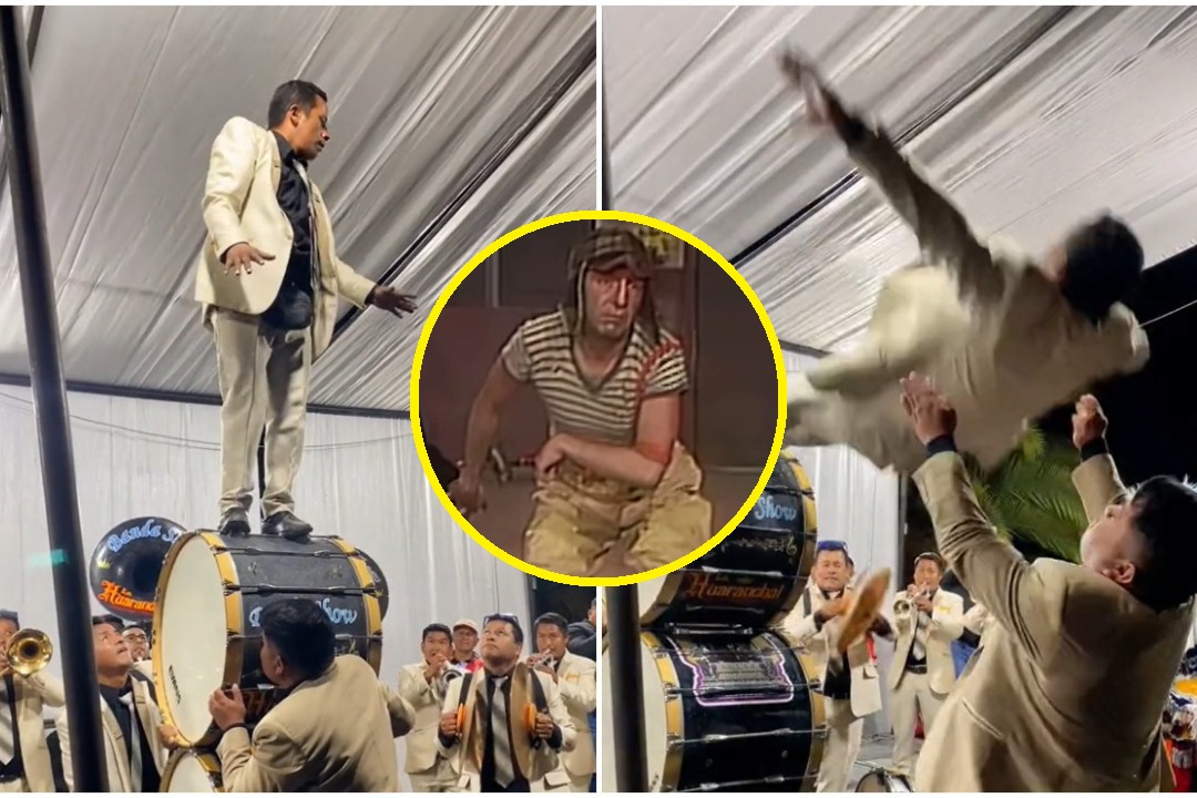 Uno de los músicos fue captado mientras estaba parado encima de dos grandes instrumentos para animar a la gente; sin embargo, la sola presencia del sujeto no fue lo que cautivó la atención de las personas, sino que haber imitado una postura del ‘Chavo del 8′ le dio popularidad al material, puesto que, estos hombres incluso le tiraron agua hasta en dos oportunidades al señor que se encontraba en lo más alto del escenario.