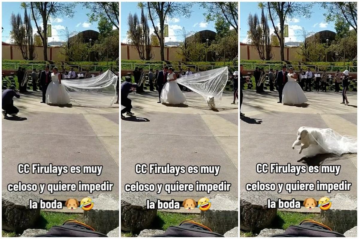 “Como cuando Firulais es muy celoso y quiere impedir la boda”, dice la descripción de este material, el cual muestra la forma en la que un perro se acercó por detrás de una pareja para tomarlos por sorpresa y provocar una divertida escena para el deleite de los internautas, los mismos que no pudieron creer lo que estaba haciendo este animal con el velo de la novia.