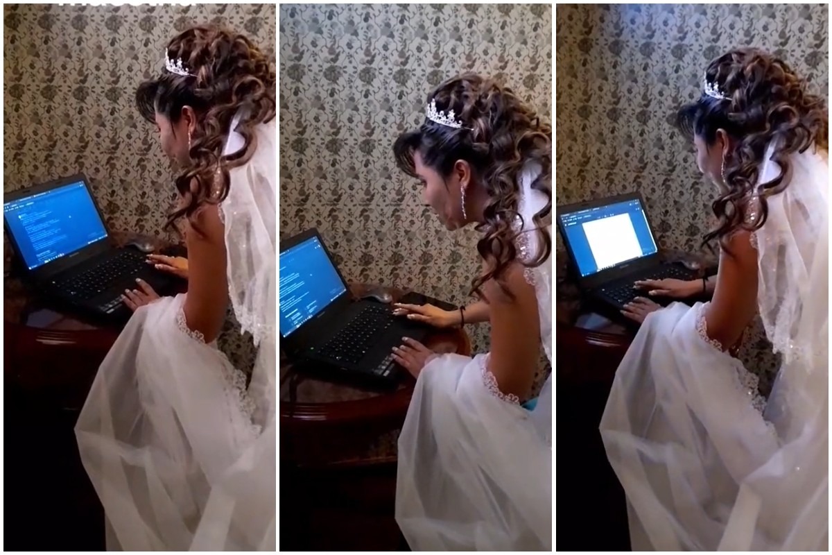 “Cuando la novia debe presentar un trabajo para la maestría”, dice la descripción que subió la mujer que preparó los detalles de la boda para detallar que, antes que la novia se dirija a la iglesia para casarse, la mujer debió presentar un trabajo para poder tener la maestría. El ahora famoso clip tiene más de 500 mil reproducciones y ha divertido a mucha gente.
