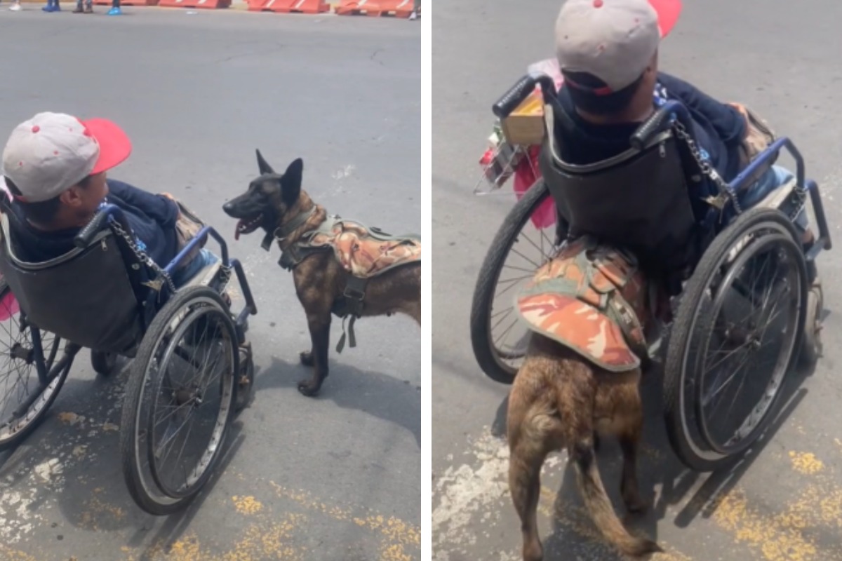 De acuerdo a las imágenes, el hombre aparentemente padece alguna incapacidad para desplazarse por sus propios medios y es su pequeño perro quien lo ayuda a movilizarse por las calles.