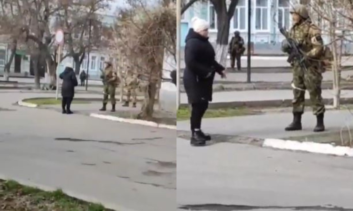 El suceso tuvo lugar en Henychesk, región de Kherson, donde vemos al soldado ruso parado en una esquina, la mujer vestida en colores oscuros se acerca para reclamarle el por qué están en su tierra, mientras el militar trata de no perder el control asegurando que solo están realizando ejercicios.