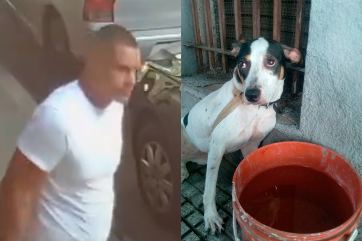 Vestido con una playera blanca, bermudas azules y tenis negros el mal hombre no contaba en que todo su despreciable accionar quedaría registrado, incluso el momento en el que se le ve huyendo del lugar ante la mirada de la perrita quien estuvo un día entero sin beber ni probar alimento.