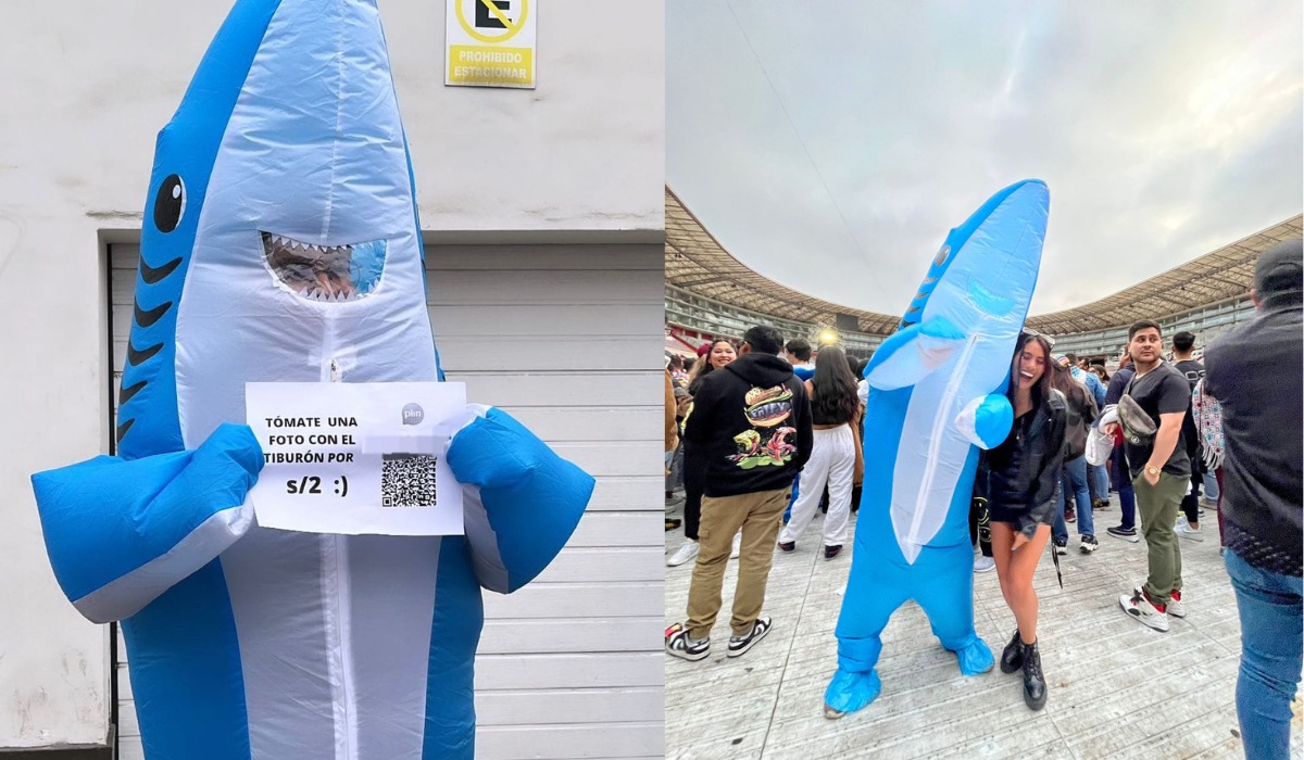 Sin duda alguna, uno de los atractivos dentro de los conciertos de Bad Bunny en todo el mundo han sido las personas vestidas de tiburón. En Perú, un joven decidió aprovechar dicha oportunidad para vestirse del animal y cobrar dos soles por cada fotografía con él.