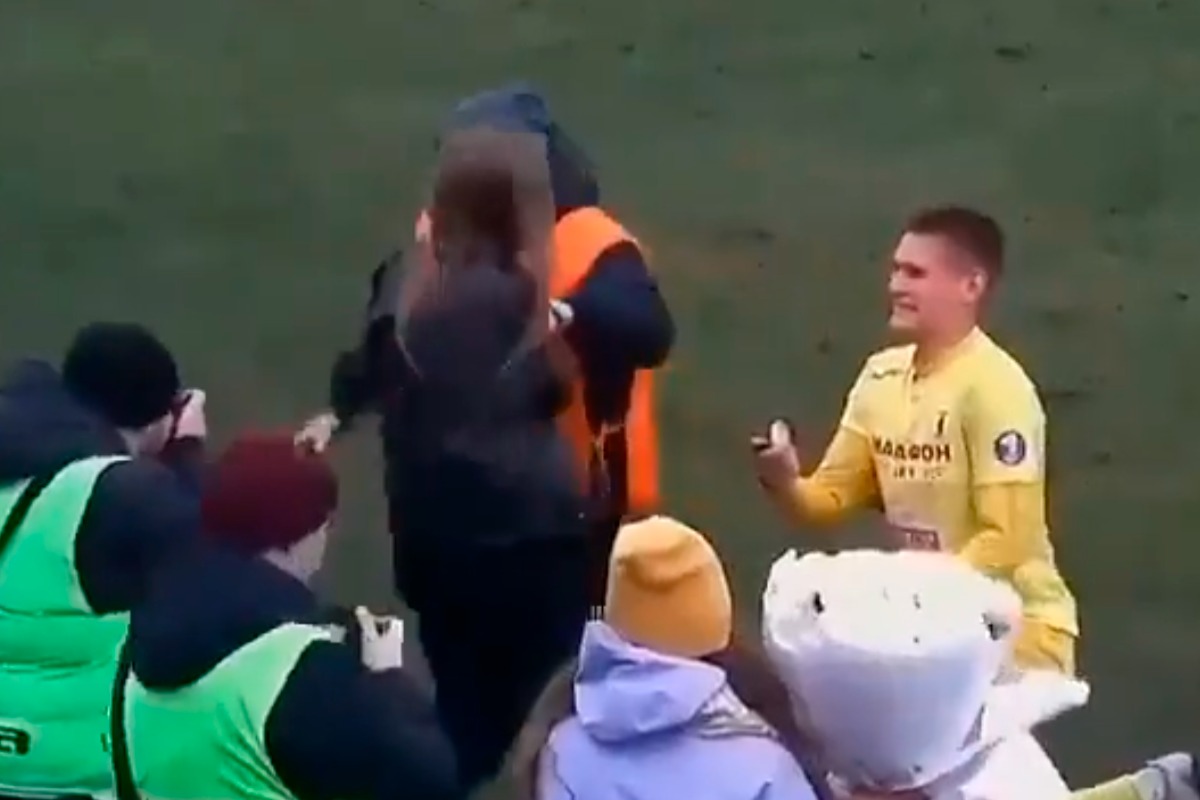 Fue a través de Twitter, que la cuenta @Fodboldworld compartió las imágenes que muestran al equipo de segunda división de futbol de Bielorrusia en el campo, cuando de pronto el jugador Vladislav Shubovich, tras anotar un gol, se arrodilla al ver que su novia se le acerca luego de la celebración; sin embargo, uno de los guardias impide que ella se llegue dándole un fuerte empujón.