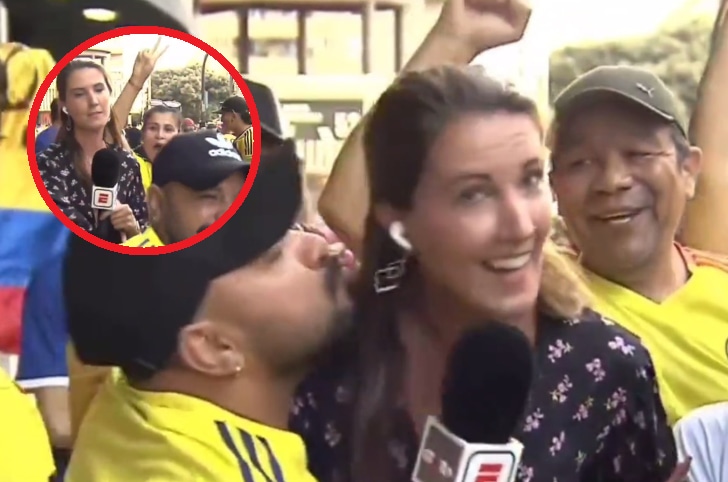 La escena deja ver que esta profesional estuvo dando detalles de lo vivido a las afueras del estadio con los aficionados colombianos, para luego revelar que un hombre se le acerca para intentar darle un beso en la mejilla, pero sin mucho éxito, ya que, la periodista reaccionó de manera rápida para impedir el acoso.