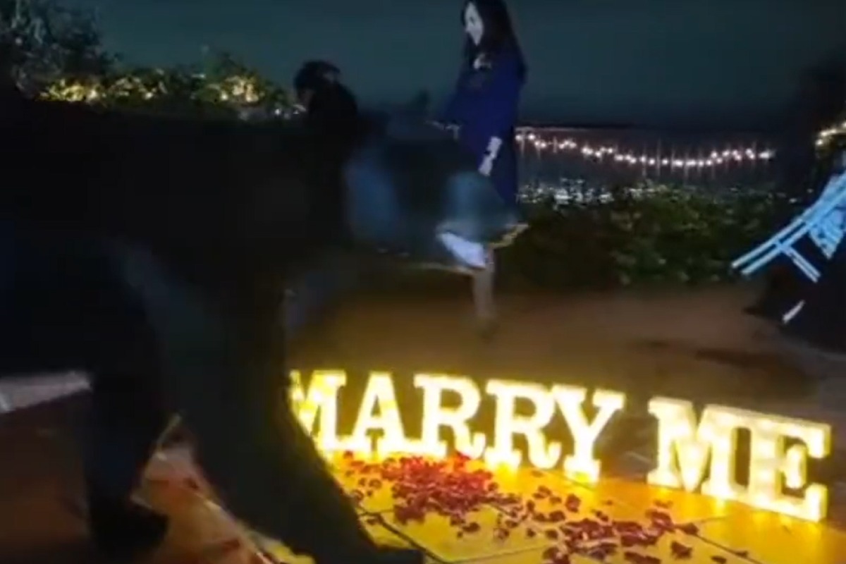 Un hombre se encontraba arrodillado en medio de una escena romántica para pedirle matrimonio a su amada, cuando de repente un oso negro de grandes proporciones se cruzó en medio de la grabación del acompañante, interrumpiendo el emotivo ritual.