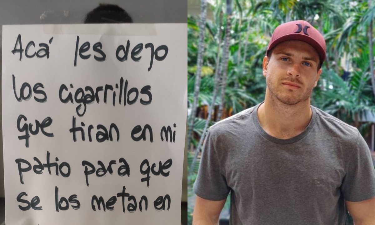 La imagen nos muestra que el sujeto pegó un papel en una ventana, en cuya parte inferior hay una bolsa llena de colillas de cigarro: “Acá les dejo los cigarrillos que tiran en mi patio para que se los metan por el orto (trasero). Gracias”.
