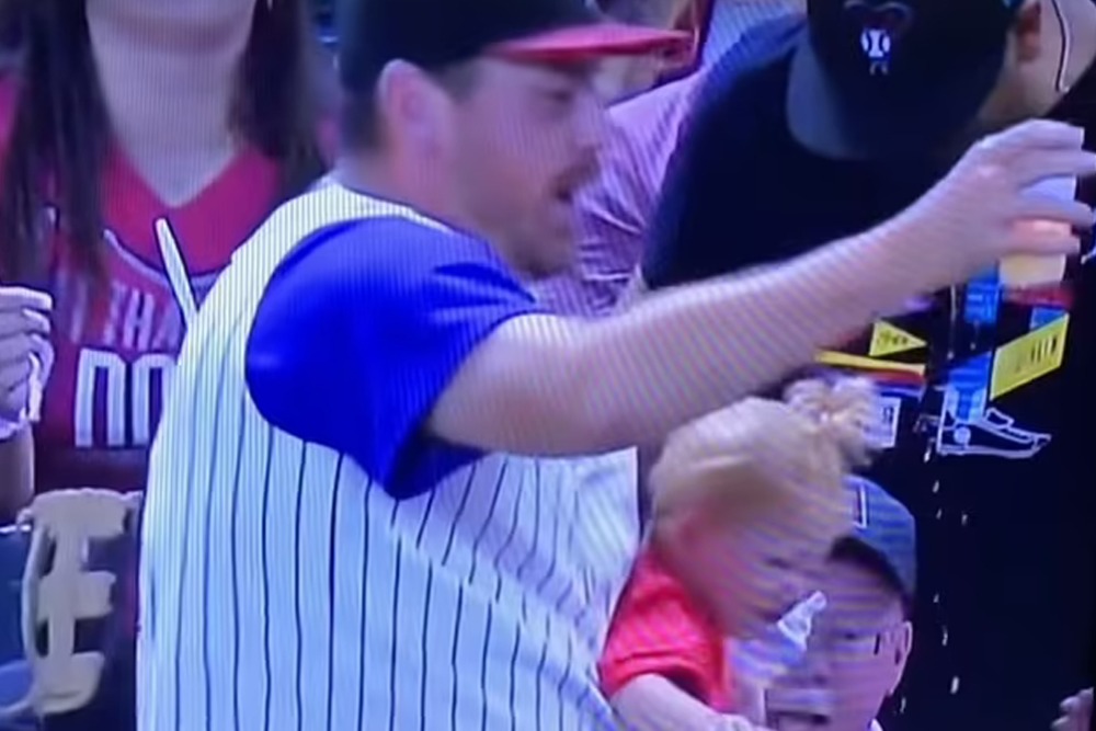 Un momento dramático se vivió en pleno juego de Baseball cuando un padre realizó una increíble atrapada mientras sostiene a su bebé y una cerveza durante un juego de béisbol... ¡Y ninguno de los dos cae!
