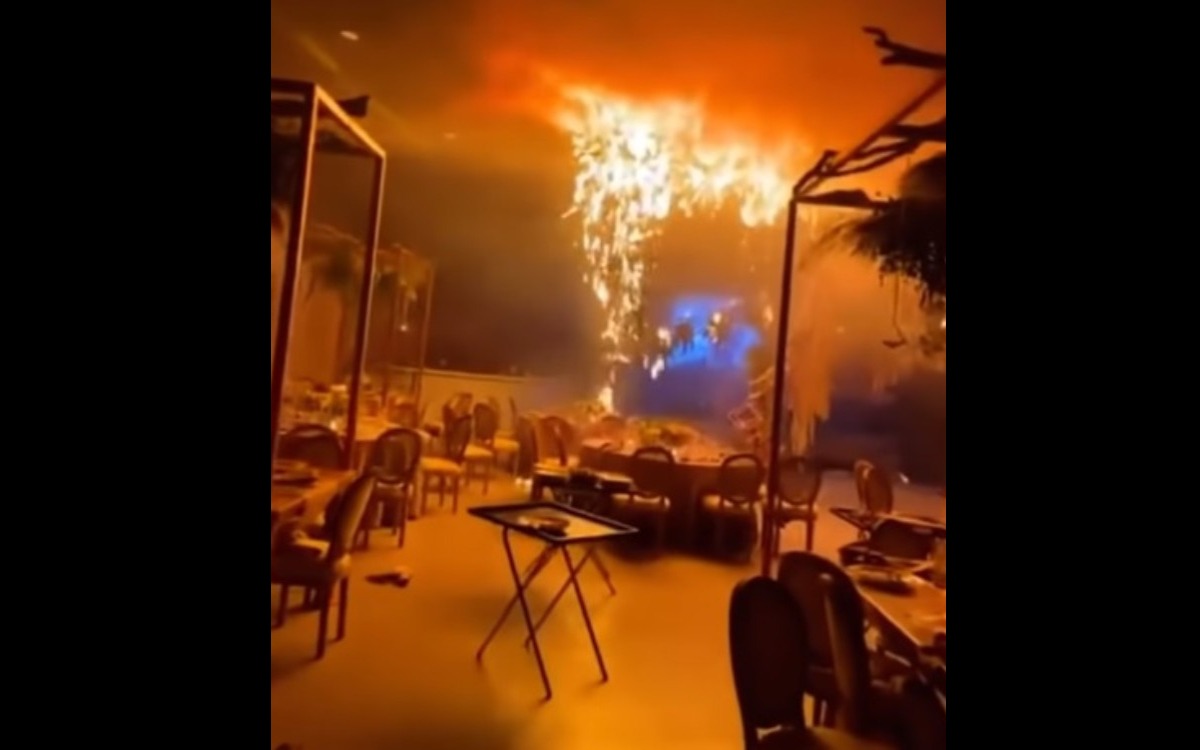 Según se puede ver en los videos difundidos en redes sociales, una chispa prendió fuego el follaje seco colocado en el techo y este empezó a arder sin que nadie pudiera evitarlo. Algunos de los invitados empezaron a reír, creyendo que el suceso era parte del espectáculo; sin embargo, su actitud cambió cuando el techo se desplomó.