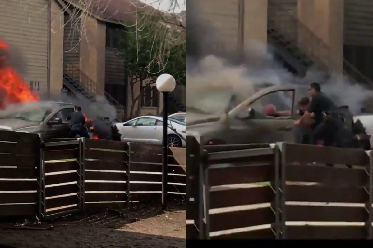 Mientras uno de los agentes intenta sacar al hombre por la ventana rota, el otro es visto con un extintor en las manos y empieza a usarlo para apagar las llamas. Poco después, la persona del interior del vehículo es puesta a buen recaudo para que sea atendido por los paramédicos.