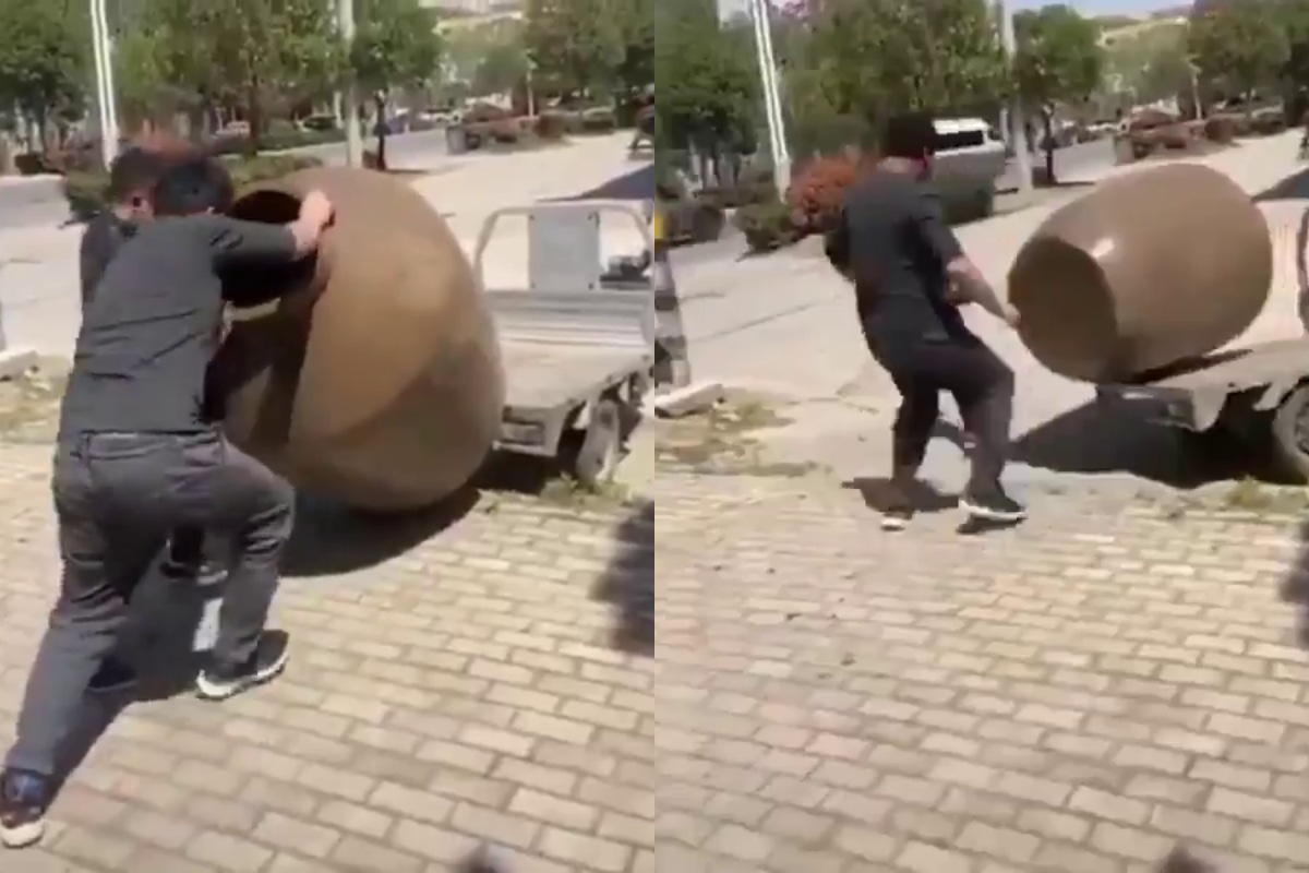 Se trata de un video viral de menos de un minuto de duración compartido el pasado 30 de abril en Twitter por la cuenta @ActualidadRT que muestra cómo dos empleados intentan de todas las formas que se pueden imaginar para cargar la vasija en un diminuto remolque.