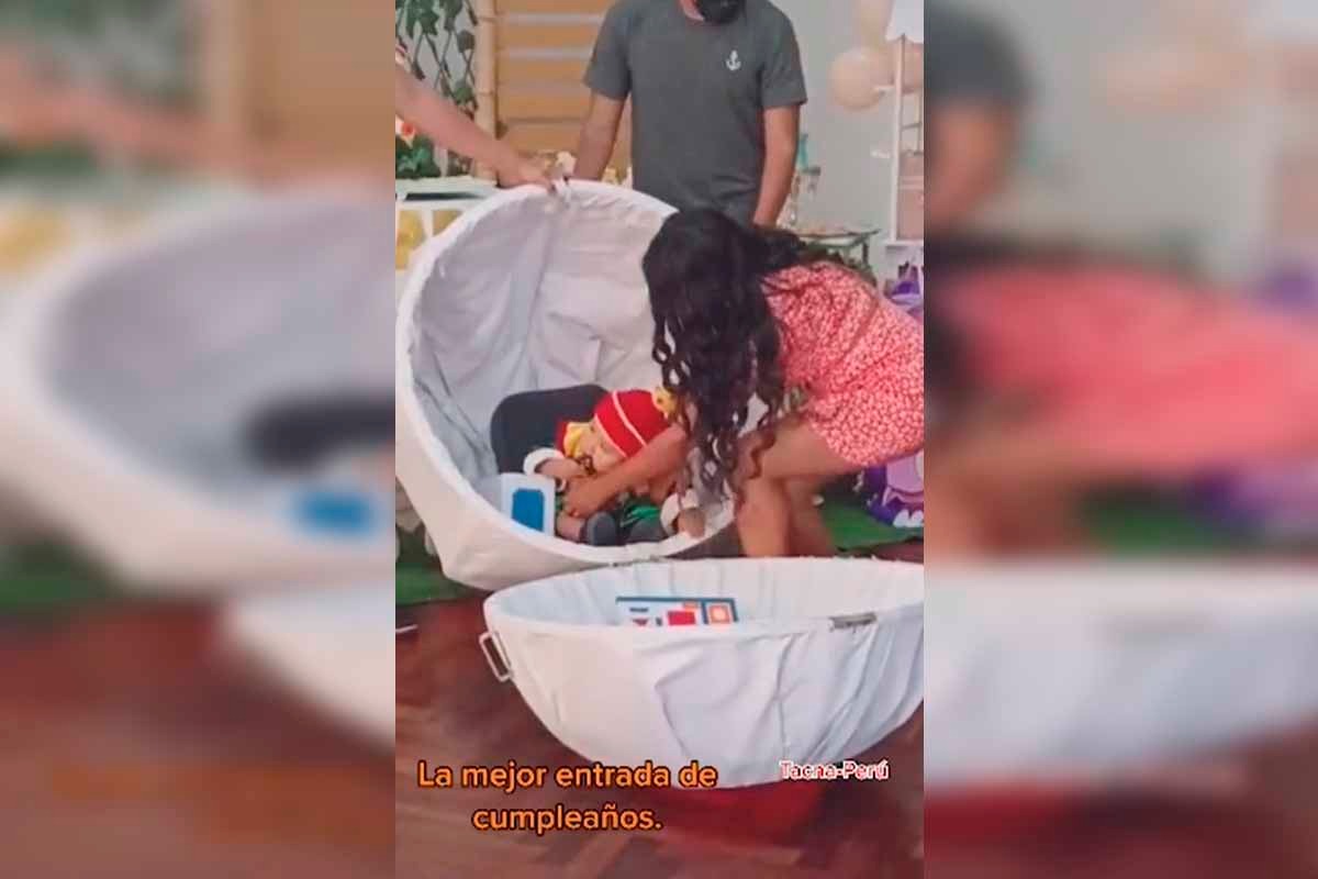 El video viral se logra ver al niño de apenas un año haciendo su entrada de manera espectacular mientras todos los asistentes aplauden la genial idea que seguramente tuvieron sus padres.