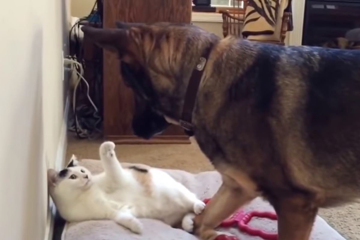 El can, lejos de querer atacarlo, solo hizo un movimiento rápido y asustó al pequeño felino, que acabó yéndose de la cama. Miles de usuarios de YouTube, se quedaron asombrados con el comportamiento del pastor alemán, ya que nunca se mostró agresivo, solo quería que el gato se fuera.