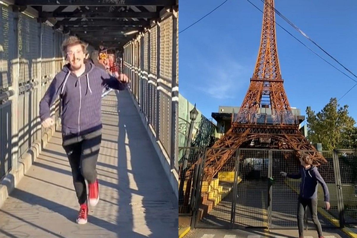 El influencer se muestra corriendo de un lugar a otro y pasando por el puente peatonal y el Palacio Municipal sobre la calle Eva Perón, luego por la Plaza 20 de Febrero hasta llegar a tres réplicas de los monumentos del arquitecto Rubén Díaz. Es ahí que aparece la Torre Eiffel ubicada a metros de la avenida Santa Rosa. “Igualita a la francesa, no pude entrar porque estaba cerrada. Igual acá la gente se mete por los techos”, agrega.