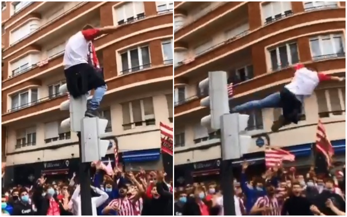 El hecho en cuestión es protagonizado por un joven que decidió subirse a lo alto de un semáforo para, segundos después, lanzarse tras ser alentado por los hinchas que lo miraban desde el suelo; sin embargo, lejos de atraparlo, optaron por hacerse a un lado y no atrapar al seguidor que, algo aturdido, se puso de pie rápidamente y levantó los brazos para celebrar su acto.