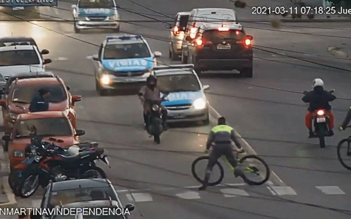 En cierto punto de la intersección de las avenidas San Martín e Independencia, un “bici-vigía” que se encontraba cerca no dudó en cruzarse en el camino del sospechoso tras darse cuenta de lo que estaba pasando. Deteniéndose en medio de la calle, el valeroso oficial del video viral de YouTube sostuvo su bicicleta y la arrojó al motociclista para impedir que escapara.