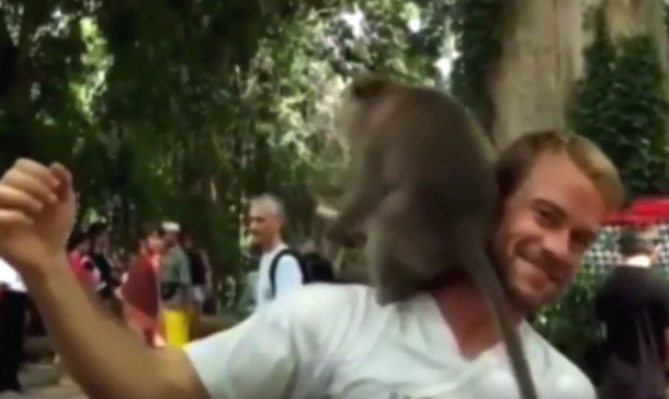 En el video que ya circula como pólvora en las redes sociales se ve que un mono se sube hasta el hombro del joven, que parece ser un turista estadounidense, para tomar lo que parece ser un pedazo de fruta.