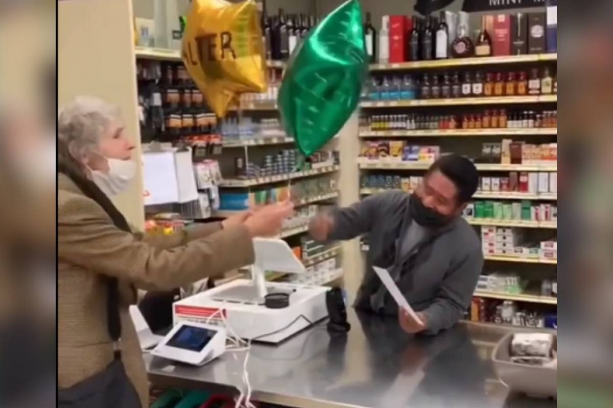 Al ver a la señora acercarse al mostrador, el cajero quedó totalmente impactado pues no podía creer que cumpliera su promesa. Visiblemente emocionado tras recibir un sobre cerrado y los globos, Walter se acercó para darle un fuerte abrazo de agradecimiento, todo esto con el fondo de aplausos de las personas que estaban en el local.