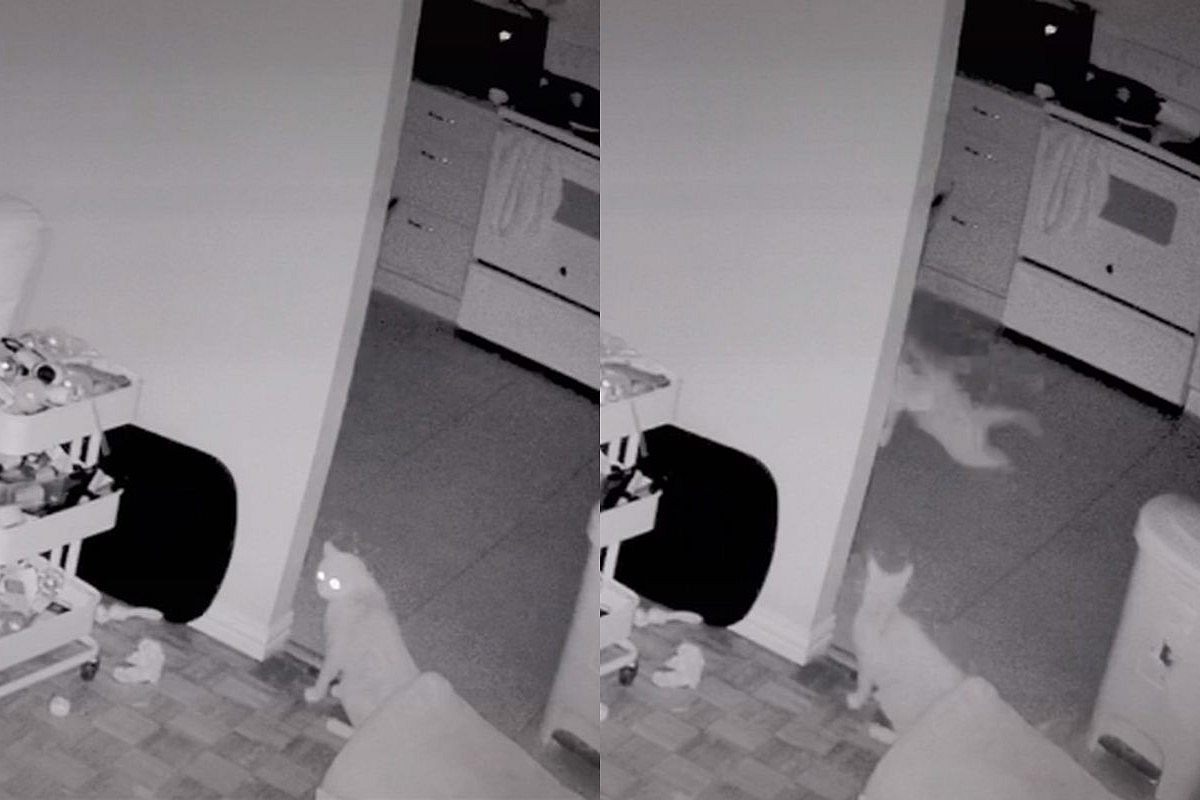 En las imágenes se aprecia cómo todas las mascotas de la casa, entre perros y gatos, se encuentran algo inquietos, pero uno de los felinos es el que más llama la atención luego de salir de la cocina debido a que pareciera que alguien estuviera siguiéndolo o intentando tocarlo.