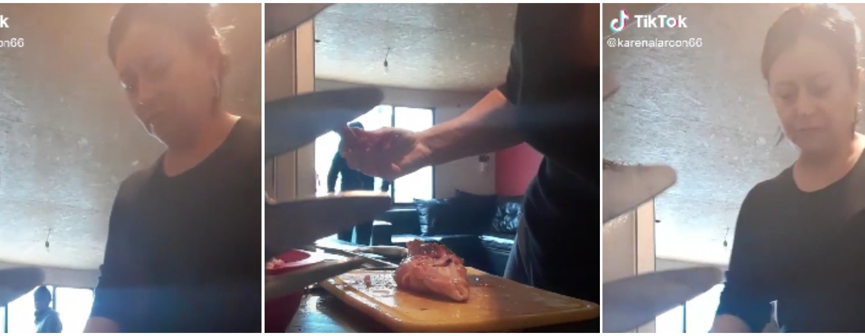 La broma empieza mientras la mamá se encontraba cortando un pollo con un cuchillo encima de una mesa de picar. Ella simula darle un corte sin relevancia al alimento, pero cuando el utensilio choca contra la base esta lanza un grito desgarrador al aire, generando la sorpresa y preocupación de sus acompañantes, quienes con la mirada buscan saber qué pasó.