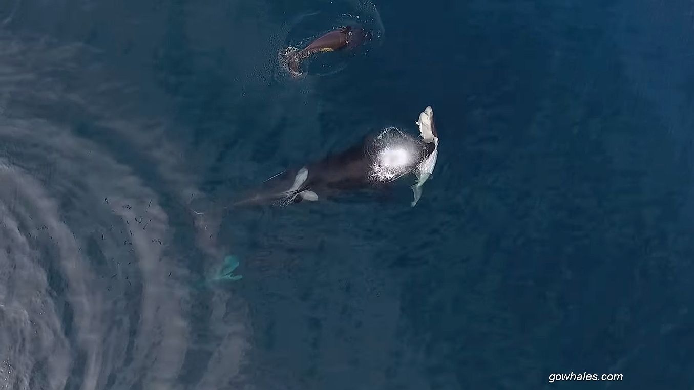 El video que ves al inicio de esta nota fue captado por un dron en la bahía de Monterey (California, costa oeste de Estados Unidos). En él se ve cómo dos orcas hembras, acompañadas de una cría cría, caza, atrapa y devora un tiburón. Las imágenes de YouTube muestran al tiburón como un inocente pececito en las mandíbulas de la orca asesina, mucho más grande y fuerte que su presa.