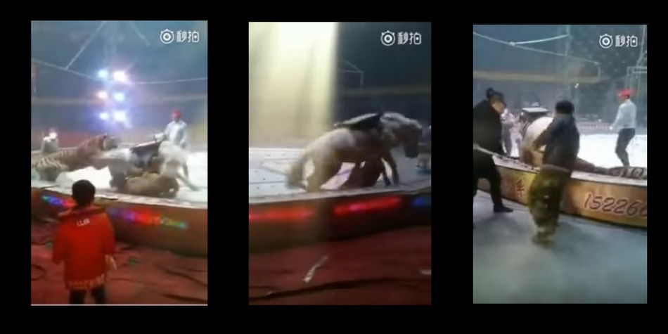 Un niño observa sin moverse la pista de un circo. Sobre ella se encuentran un caballo, un tigre, una leona y el domador, quien ha perdido el control de todo y azota con un látigo a los felinos. El hecho ocurrió en un circo de la provincia de Hebei en China y el video viral de YouTube no deja de recibir las críticas.