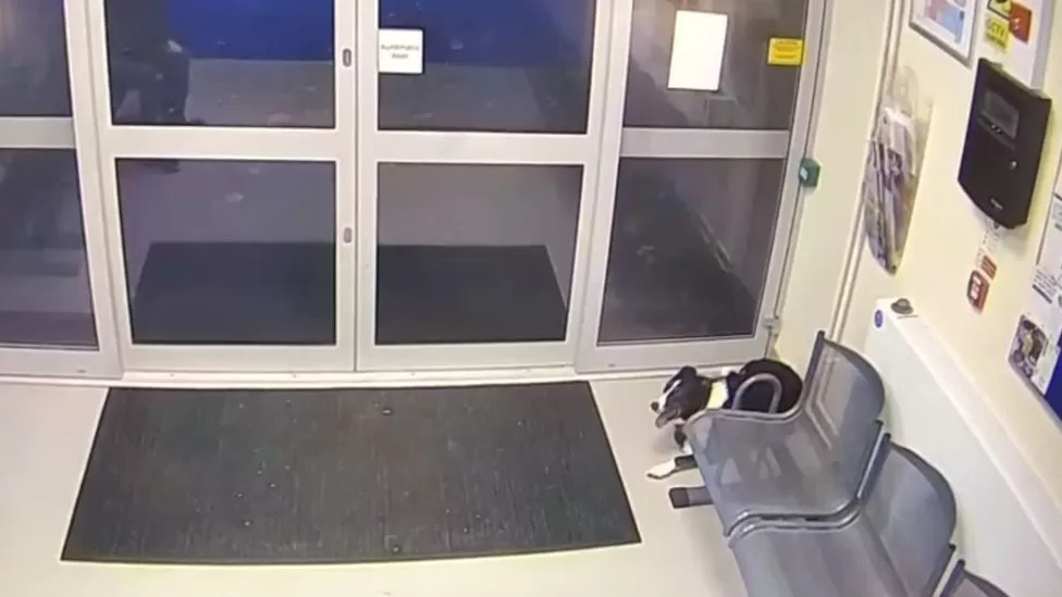 Las imágenes de las cámaras de vigilancia de la estación de policía de la localidad de Loughborough capturaron el momento cuando el border collie llega a la estación y se siente en la sala de espera.