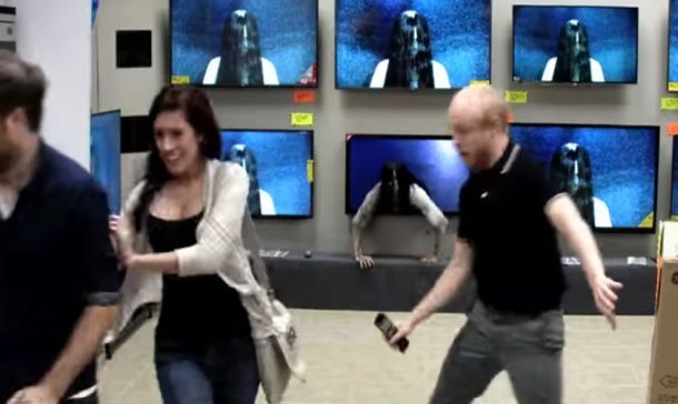 Como se ve en el video de YouTube, una falsa pared es acondicionada para que frente a ella sean colocados los televisores que verán los clientes. Lo que ellos no saben es detrás de unas de las pantallas se encuentra la protagonista de 'El Aro' o al menos un imitador muy bien maquillado y dispuesto a hacer gritar a todos los presentes.