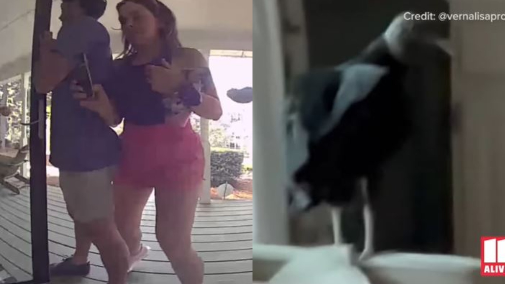 A FOX Weather, Vernalisa contó: “los buitres comen cosas muertas, asumí que era mi perro y se lo estaba comiendo”. En eso, al sujeto no se le ocurrió mejor idea que sacar el celular para grabar mientras la novia coge un paraguas con un plan en mente.